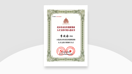 北京市高層次創(chuàng)新創(chuàng)業(yè)人才支持計劃入選證書