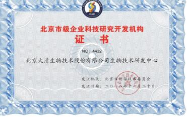 2018年11月20日,北京市科學技術委員會公示了2018年度北京市級企業科技研究開發機構擬認定名單,大清生物研發中心經形式審查、書面審查、現場考察和審定,認定為北京市級企業科技研究開發機構。 企業科技研究開發機構,是指從事自然科學及科學技術相關領域研究開發和試驗發展的企業,或者企業內部從事技術開發、產品開發、工藝開發以及有關技術服務的機構,是企業開展技術創新、實現科技進步的基礎條件