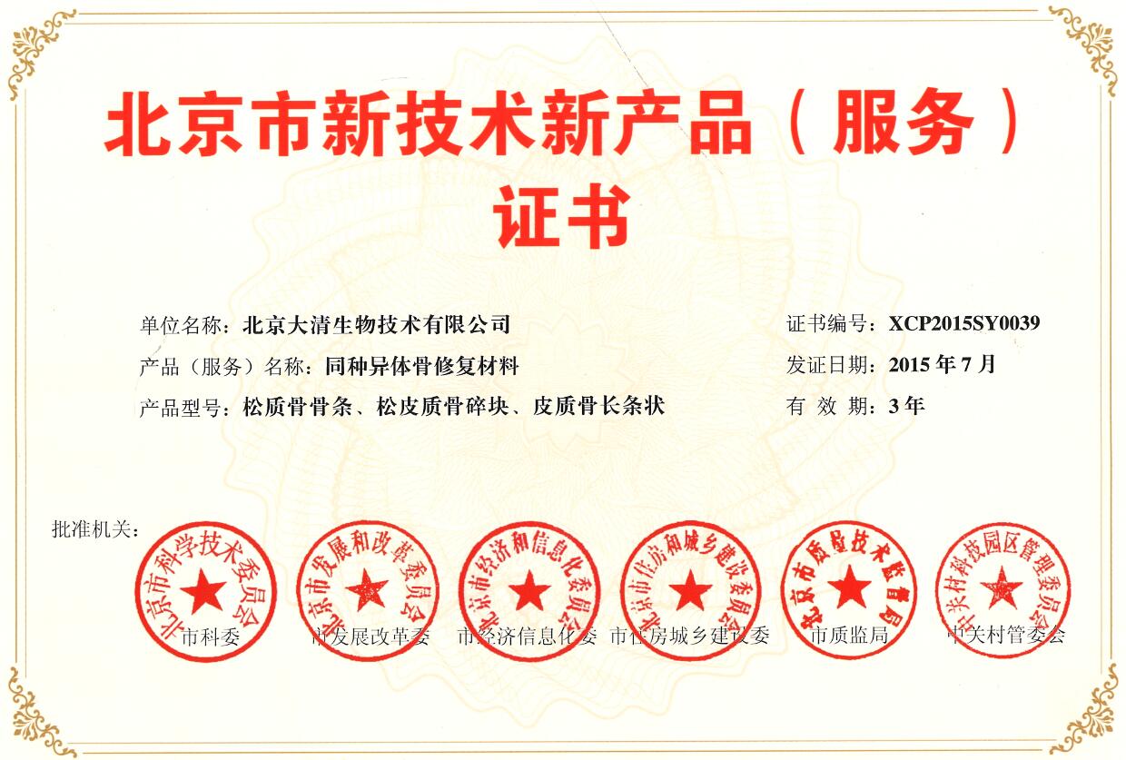 2015年北京大清生物技術有限公司作為課題承擔單位聯合解放軍總醫院及第三軍醫大學研發的生物和醫藥技術領域再生醫學前沿技術與應用研究項目“引導骨組織再生關鍵技術及產品研發(2015AA020315)”課題被列入國家高技術研究發展計劃(863計劃)。