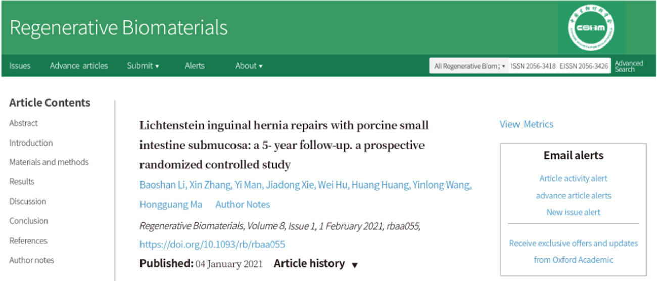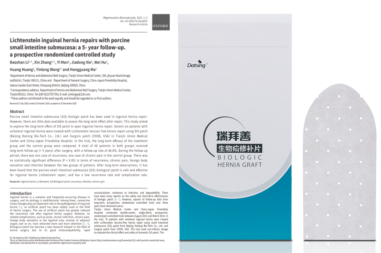 2021年1月4號,由天津市人民醫院王蔭龍、李寶山專家團隊研究和撰寫的論文《Lichtenstein inguinal hernia repairs with porcine small intestine submucosa: a 5-year follow-up. a prospective randomized controlled study》(豬小腸粘膜下層生物補片在李金斯坦修補術中的應用療效觀察:5年隨訪,一項前瞻性隨機對照研究)在國際知名期刊Regenerative Biomaterials正式發表,文章對應用大清生物公司生物疝修補片(瑞拜善)在腹股溝疝修補術中的長期療效進行了積極評價。這是瑞拜善臨床應用的首篇英文SCI文章,也是大清生物公司產品首次榮登SCI核心期刊。