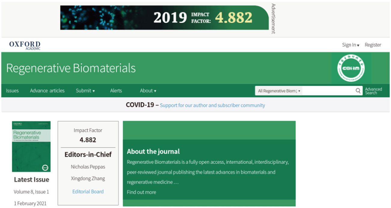 Regenerative Biomaterials (RB)是中國生物材料學會與牛津大學出版社合作出版的國際英文學術期刊。RB是同行評審的在線開放獲取刊物,旨在為研究人員提供一個分享有關生物材料前沿研究與新發現的國際平臺,尤其是用于再生醫學的生物材料,內容涵蓋生物材料的基礎科研和臨床應用。目前被PubMed,SCI-E等數據庫收錄。RB雜志2019年度影響因子高達4.882(影響因子是衡量學術期刊影響力的一個重要指標),在Web of Science同類別期刊中排名前26%(Q2)。