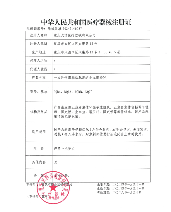 北京大清生物全資子公司重慶大清醫療器械有限公司與協和醫院醫工貿合作的創新產品吉芷凝(一次性使用橈動脈壓迫止血器套裝)于2024年1月獲得重慶市藥物監督管理局批準。該產品是國內首創用于遠橈動脈(左手合谷穴,右手合谷穴,鼻煙窩、暨包括近橈動)介入手術后,對穿刺部位進行壓迫閉合止血時使用。該產品研制過程中在2023年獲得中國醫療器械創新創業大賽一等獎。