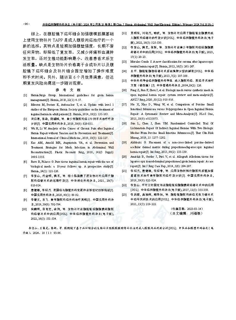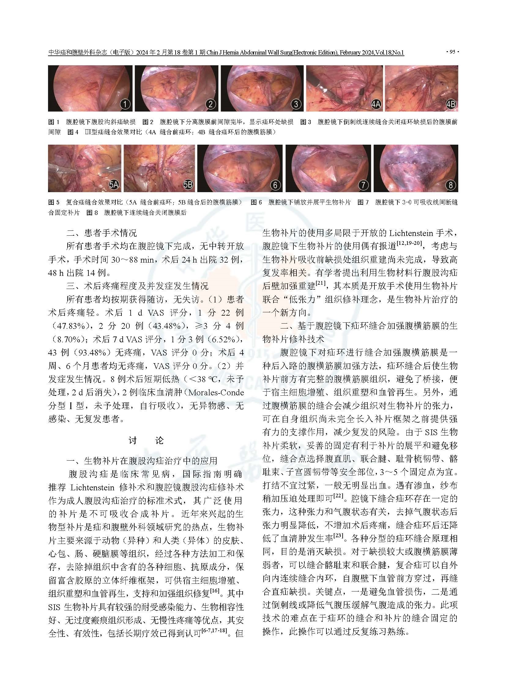 文章證明并在國內首次提出,在基于疝環縫合、加強腹股溝管后壁的基礎上,使用SIS生物補片,6個月隨訪效果滿意。其特點是短期加強腹壁強度,長期不留任何異物,既降低了復發率,又減少疼痛和血清腫發生率,還對生殖功能影響最小,改善患者術后生活質量。