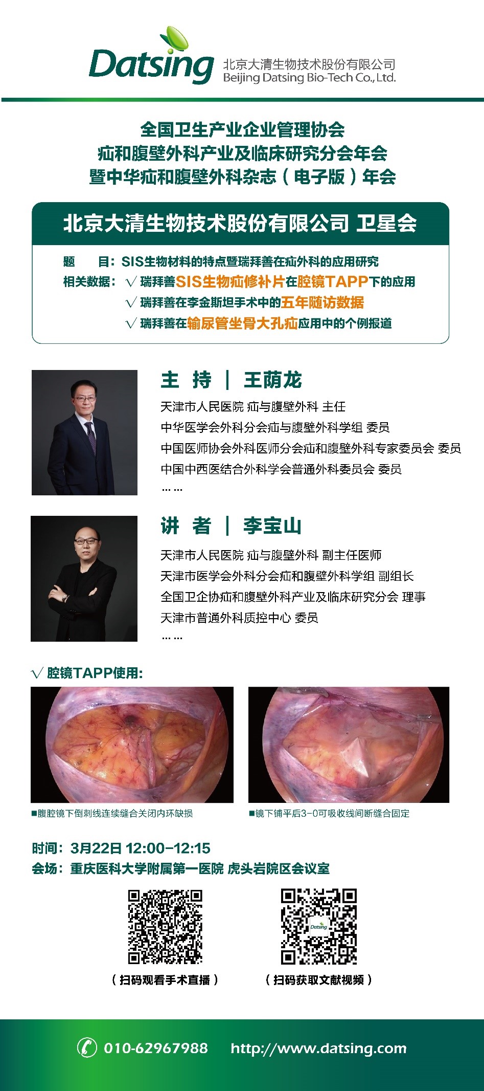 同時,在3月22-23日于重慶舉辦的全國衛企協疝和腹壁外科產業及臨床研究分會年會 暨 中華疝和腹壁外科雜志(電子版)年會上,王蔭龍、李寶山兩位老師也會針對SIS生物疝修補片的特點以及瑞拜善在疝外科的應用研究做相應的分享和報告,歡迎各位至現場聆聽交流!