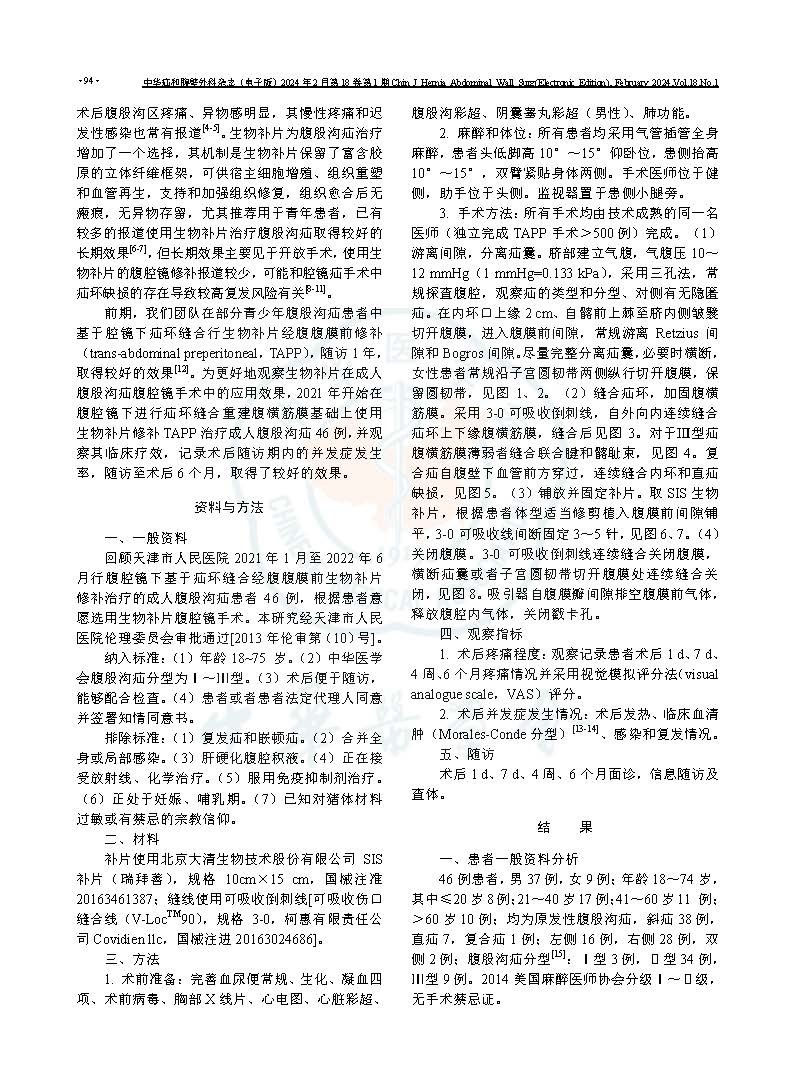 研究回顧了天津市人民醫院2021年1月至2022年6月,46例成人腹股溝疝患者在疝環縫合基礎上使用北京大清公司的瑞拜善SIS生物補片行TAPP的臨床資料,觀察了患者術后1 d,7 d,4 周,6個月 復發、疼痛、血清腫、感染等指標。最終,46例患者術后均隨訪至6個月,隨訪率為100%,隨訪期間,無復發,無慢性疼痛,無感染和異物感,發生血清腫2例。