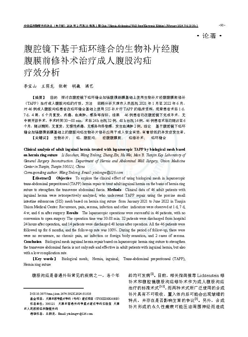 日前,由天津市普通外科學重點建設學科實驗室、天津市人民醫院疝與腹壁外科王蔭龍、李寶山團隊回顧分析的應用研究數據《腹腔鏡下基于疝環縫合的生物補片經腹腹膜前修補術治療成人腹股溝疝療效分析》在中文核心期刊《中華疝和腹壁外科雜志(電子版)》第18卷、第1期正式發表。