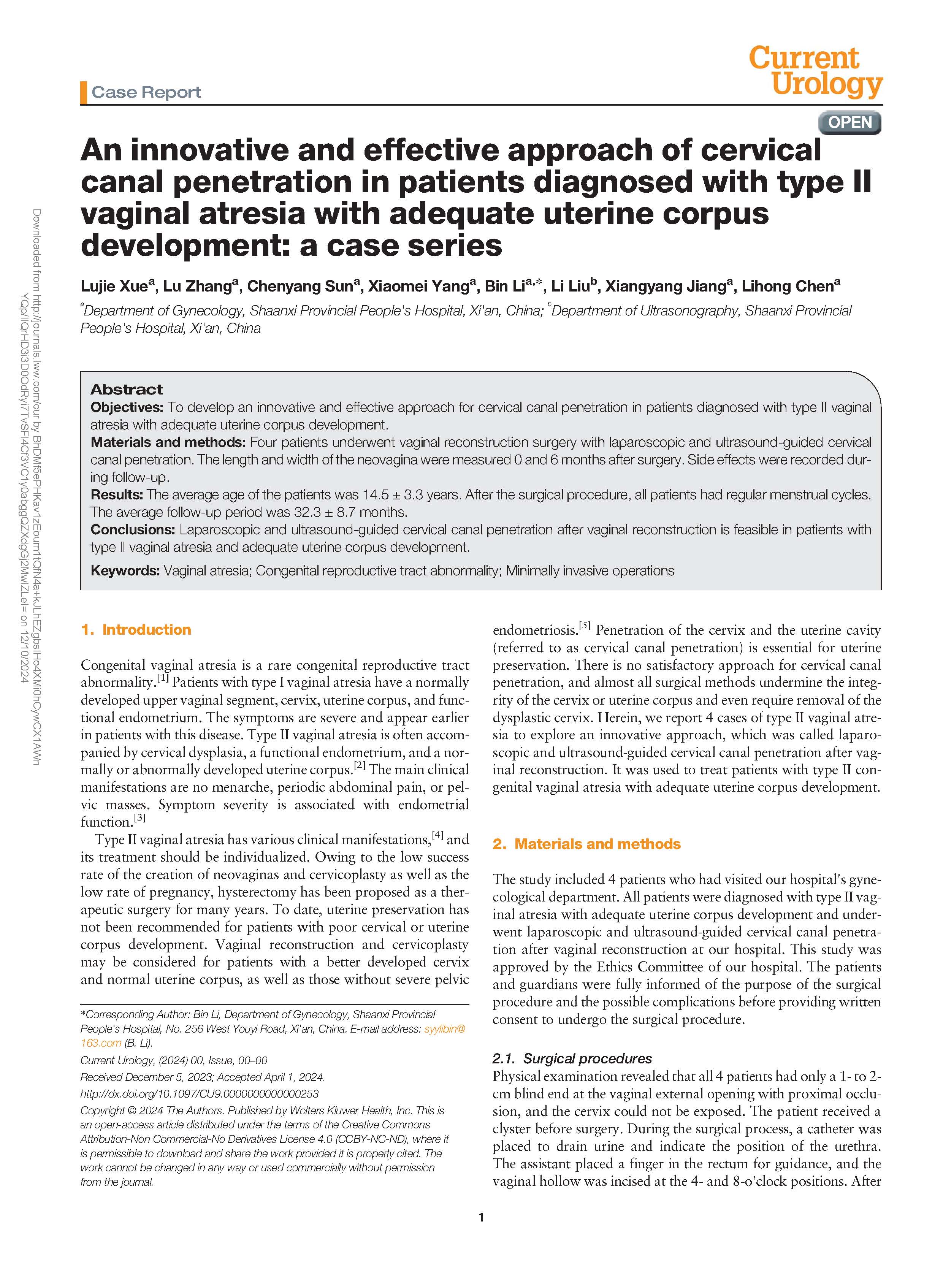 該研究由陜西省人民醫(yī)院婦產(chǎn)科的李玢團(tuán)隊(duì)完成,他們針對(duì)子宮體發(fā)育良好的II型陰道閉鎖患者進(jìn)行了創(chuàng)新性的手術(shù)治療。先天性陰道閉鎖是一種罕見(jiàn)的先天性生殖道異常,其中II型陰道閉鎖通常伴有宮頸上皮內(nèi)瘤變、功能性子宮內(nèi)膜以及正常或異常發(fā)育的子宮體。其主要臨床表現(xiàn)為無(wú)初潮、周期性腹痛或盆腔腫塊,癥狀的嚴(yán)重程度與子宮內(nèi)膜功能有關(guān)。傳統(tǒng)的治療方法多傾向于子宮切除術(shù),但對(duì)于宮頸發(fā)育較好、子宮體正常以及無(wú)嚴(yán)重盆腔疾病的患者而言,這顯然并非最佳選擇。因此,李玢團(tuán)隊(duì)探索了一種新方法,即陰道重建后,在腹腔鏡和超聲引導(dǎo)下實(shí)施宮頸管穿透術(shù),用于治療子宮體發(fā)育良好的II型先天性陰道閉鎖患者。