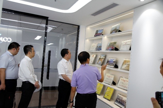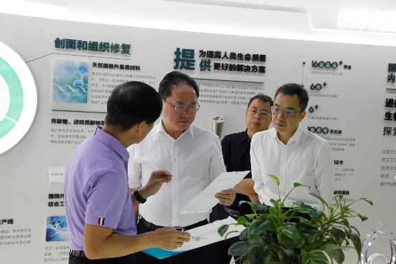 在考察交流過程中,董事長李次會先生引領大渡口區領導參觀公司展廳,介紹大清生物歷史沿革、研發產品和市場銷售以及公司未來規劃和布局。